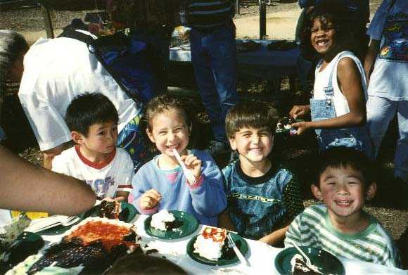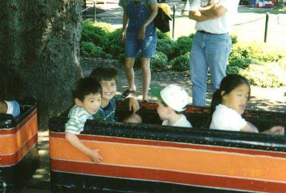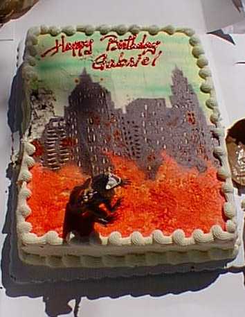 Saturday, July 4, 1998 This year's birthday party was at San Mateo Central Park. It was a beautiful sunny day, just perfect to have fun. I wore my Godzilla clothes, my Godzilla shoes, and even had a Godzilla on my cake! I had a lot of friends there, and we spent a lot of time in the playground, eating and just running around being happy. I also took a little time for a train ride with friends. |